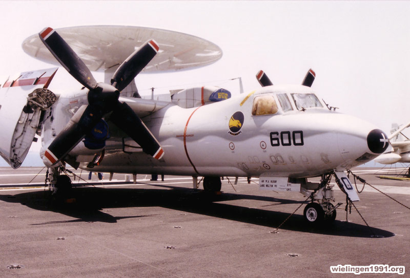 An "E-2C Hawkeye" on the flight deck of the aircraft carrier