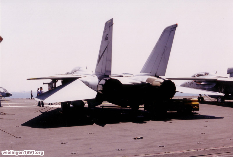 An "F-14A Tomcat" on the flight deck of the aircraft carrier