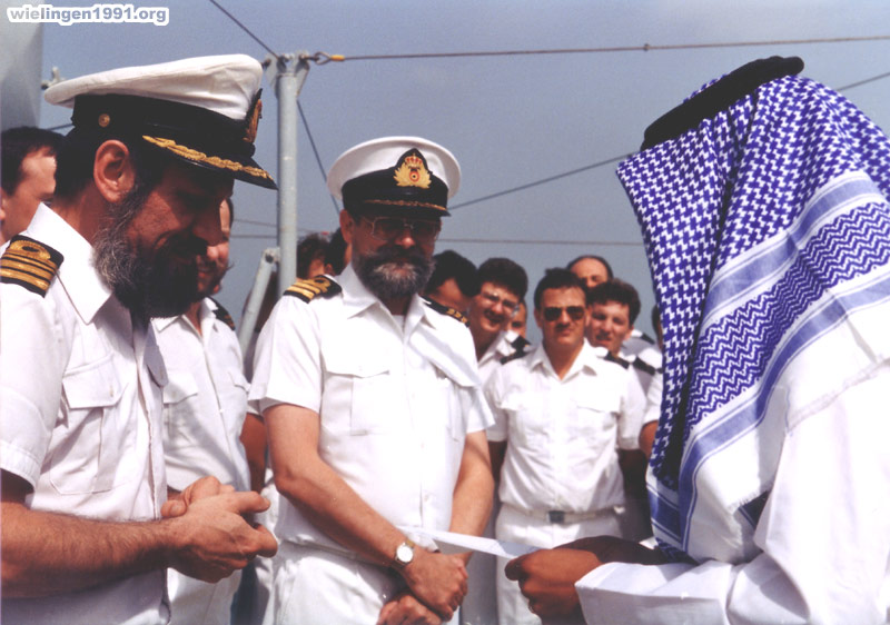L’équipage offre un cadeau au commandant pour son anniversaire. (Dubaï - Mars 1991)