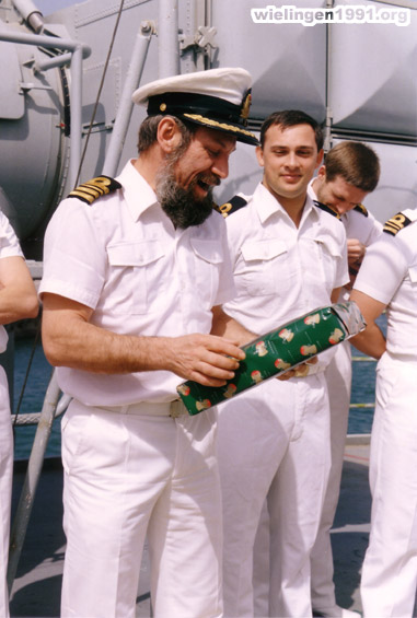 L’équipage offre un cadeau au commandant pour son anniversaire. (Dubaï - Mars 1991)
