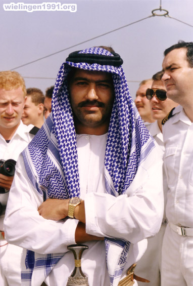 Des membres d'équipage jouent le jeux pour la remise du cadeau au commandant. (Dubaï - Mars 1991)