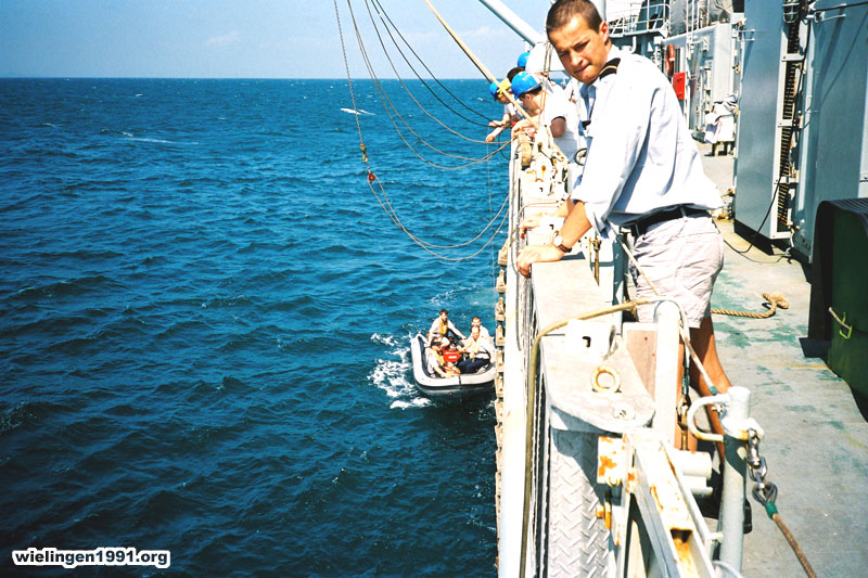 Le blessé grave est ramené du "THEBES" vers le "Wielingen" en zodiac. (