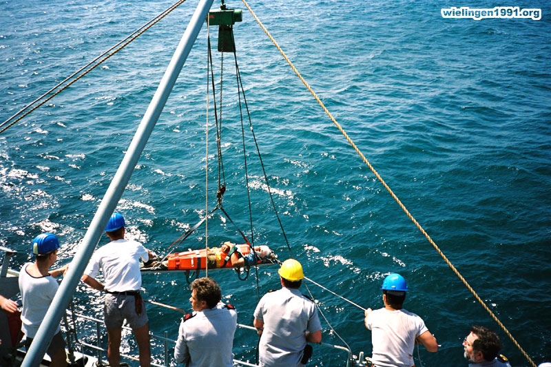 Le blessé grave est transféré du zodiac sur le "Wielingen". (