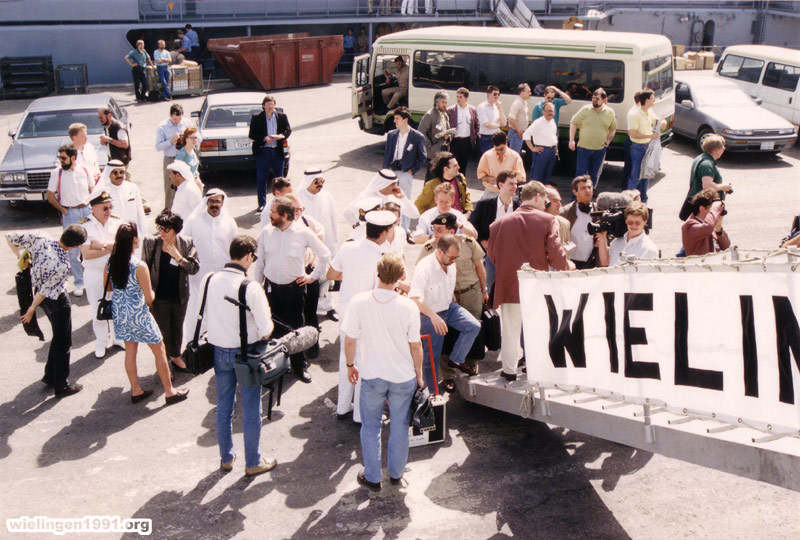 , la presse belge précède l'arrivée à bord du Ministre de la Défense Nationale. (Bahrein - 22 Avril 1991)
