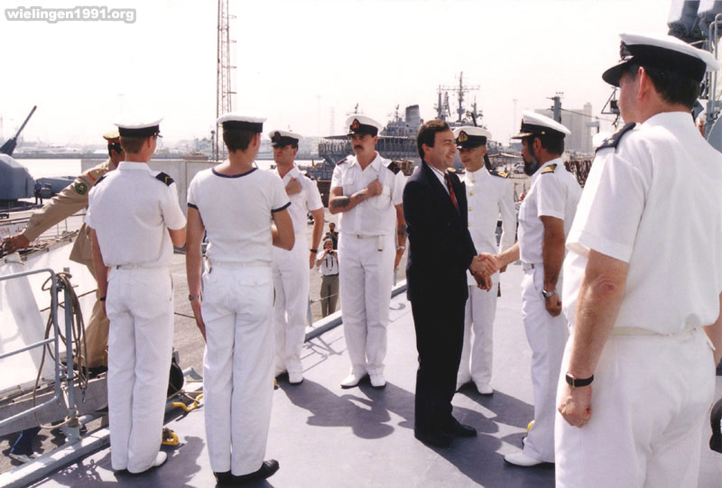 , le Ministre de la Défense Nationale, Monsieur Guy COEME visite le "Wielingen". (Bahrein - 22 Avril 1991)
