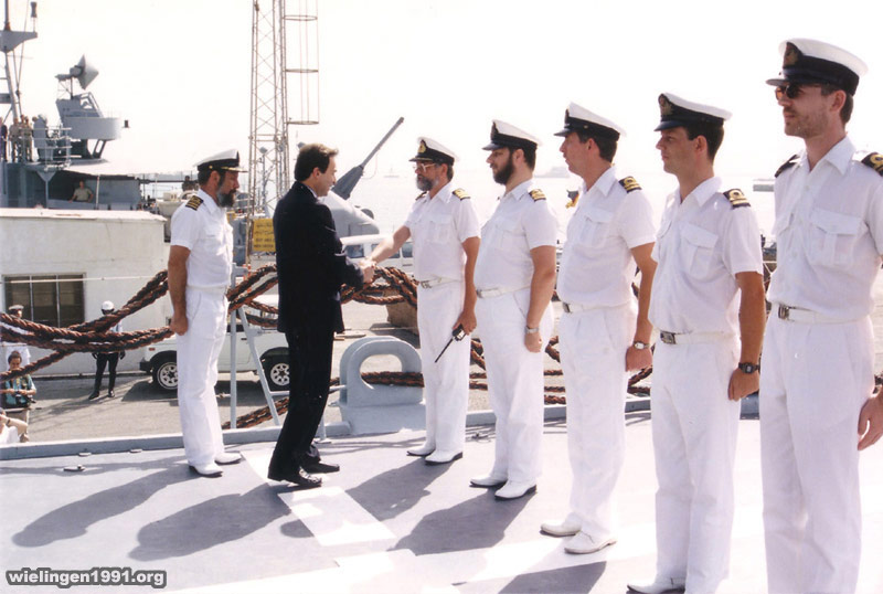 , le Ministre de la Défense Nationale, Monsieur Guy COEME visite le "Wielingen". (Bahrein - 22 Avril 1991)