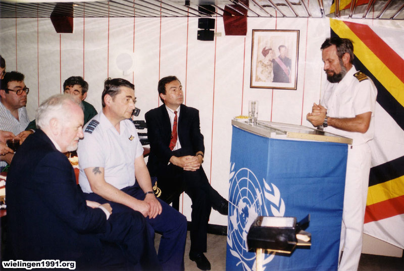 A la cafétéria, le Commandant du "Wielingen" donne une conférence de presse sur la mission du F910 dans le Golfe. (22 Avril 1991)