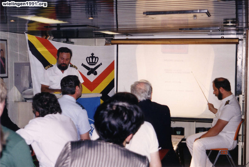 A la cafétéria, le Commandant explique sur écran géant, et avec l'aide du HOD, les missions du "Wielingen". (22 Avril 1991)