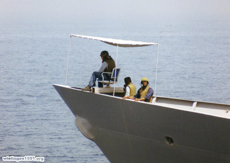 La vigie anti-mine et des membres du "RAS team" à la proue de la frégate