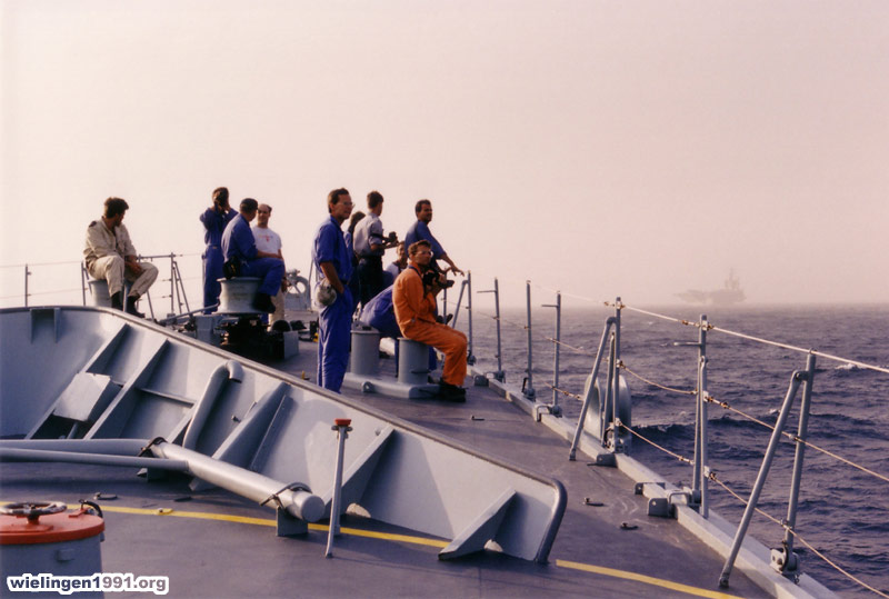 Des membres d'équipage, qui ne sont pas de quart, suivent sur le pont du F910 l'appontage des jets sur le