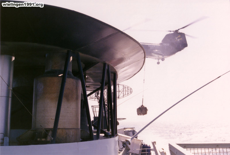 VERTREP, le "CH-46 Sea Knight" repart avec une charge de matériel. (