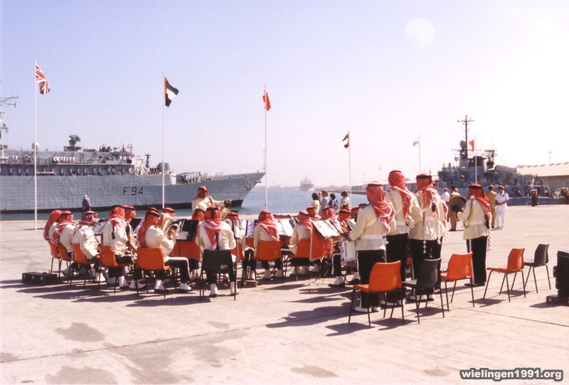 , une fanfare locale salue l'arrivée la frégate britannique