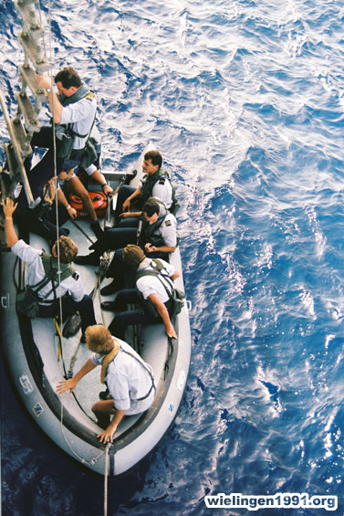Le "Boarding Team" embarque dans les zodiacs. (26 Mai 1991)