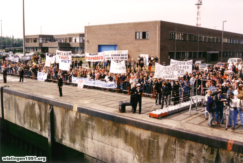 , les proches, les amis et la fanfare de la marine accueillent le "Wielingen". ( 17 Juin 1991)