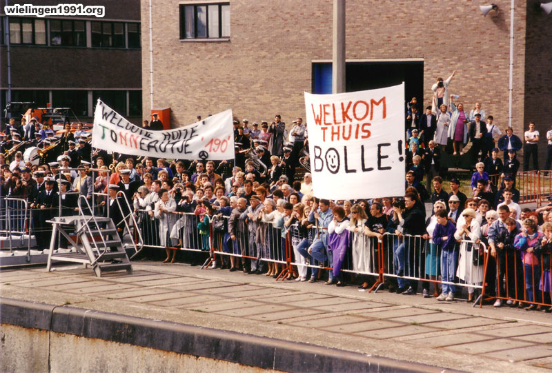 , les proches, les amis et la fanfare de la marine accueillent le "Wielingen". ( 17 Juin 1991)