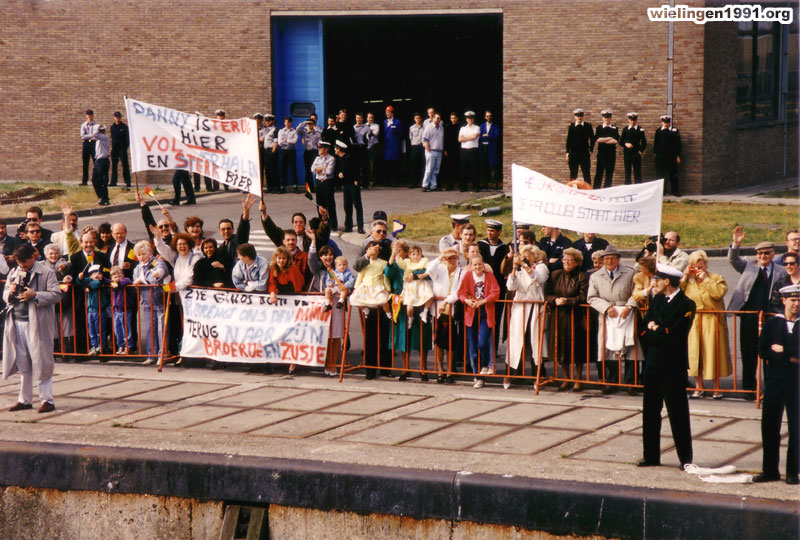 , les proches, les amis et la fanfare de la marine accueillent le "Wielingen". ( 17 Juin 1991)