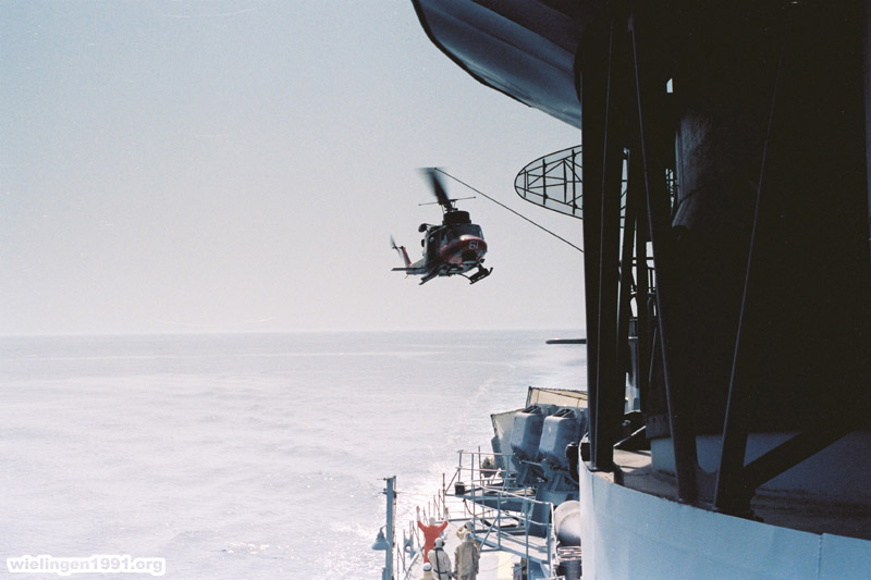 VERTREP (Vertical Replenishment) met helikopter "Agusta-Bell AB212" van de Italiaanse destroyer